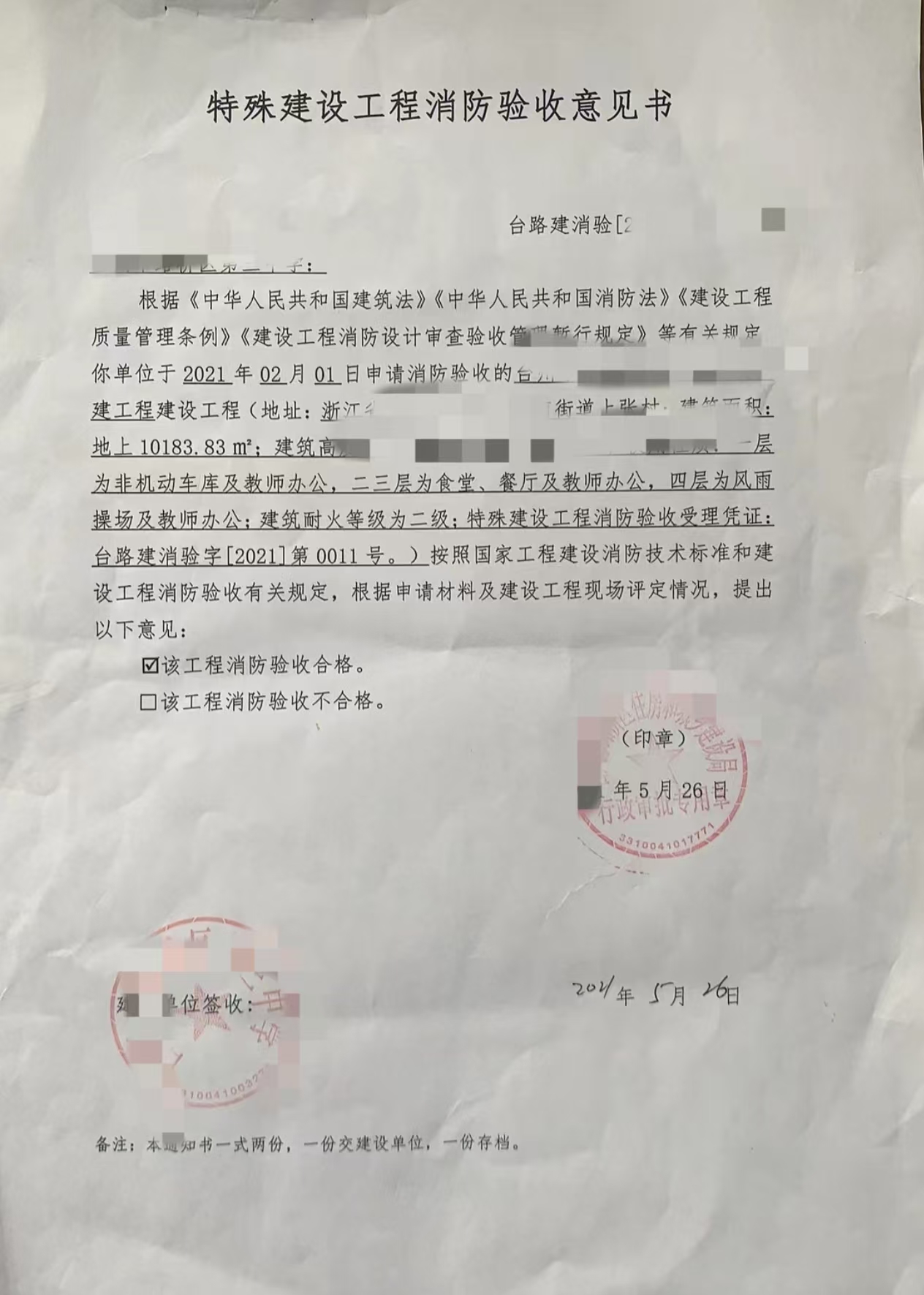 台州市建设工程消防技术审查意见书
